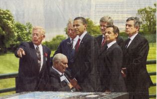 Omaha Beach, D-day 2009: wat een foto, in de Volkskrant gisteren. Twee veteranen, de Prins van Wales en vier staatshoofden, turend naar de geschiedenis. (Nu ja, president Sarkozy tuurt niet, die poseert alleen maar.) Zeven mannen, één meer dan in Rembrandts Staalmeesters, samengebalde macht in evenzoveel donkere pakken. De NRC had de foto ook, maar van het agentschap AP (deze is van Getty), en die was veel zwakker. De veteraan op de voorgrond, Ben Franklin, zit daar niet zo mooi in profiel te broeden, wat voor deze foto juist heel belangrijk is. Ik kan het niet helpen, ik vind zo’n beeld interessanter dan de hele herdenking.