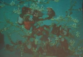Het wonderlijkste was de projectie van een schilderij van Van Gogh met bloesemtakken, heel groot op twee muren boven de hal in het Rietveldgebouw. Daarin doken op geheimzinnige wijze de mensen op die in diezelfde hal op luie stoelen zaten. Ze bewogen in het schilderij, een beetje als maden in kaas, hier en daar, de blauwe vloer en stoelen zag je niet, alleen de mensen, tegen Van Goghs turkooise achtergrond, tussen zijn wat onscherpe takken. Een hoogst merkwaardig effect. Toch eens uitzoeken wie het bedacht heeft, en of het iedere vrijdagavond te zien is – ik denk het wel.