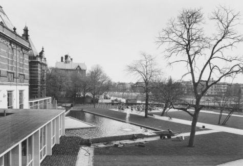 Waar nu de badkuip van het Stedelijk Museum oprijst uit het steen, was eens een echte tuin: de museumtuin. Je kon er vanuit het museumcafé inlopen om in de zon te zitten. Hij was in 1952 ingericht door landschapsarchitect Hans Warnau, in strakke lijnen, passend bij de moderne tijd die nu was aangebroken.