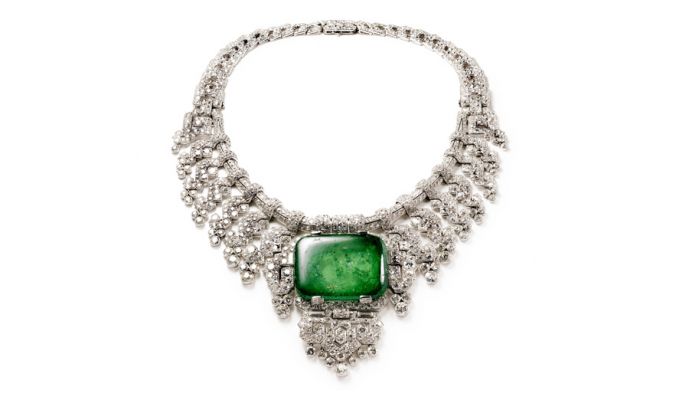 Welnu: het is een collier van platina met diamanten en een beest van een smaragd, door Cartier gemaakt voor Beatrice Mills (1883-1972), de Amerikaanse echtgenote van een Engelse aristocraat, in 1932. Sindsdien is het kennelijk weer bij de makers teruggekomen. En ik kan maar niet besluiten of ik het nu echt heel lelijk vind of niet, zozeer wordt mijn blik verward door de evidente kostbaarheid ervan. Wat eigenlijk wel een knap effect is.